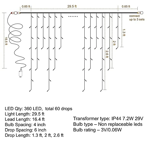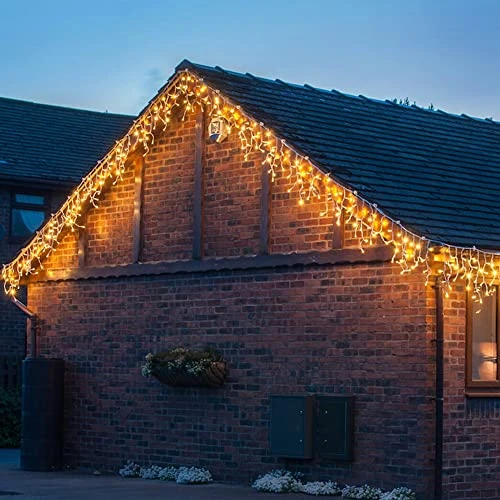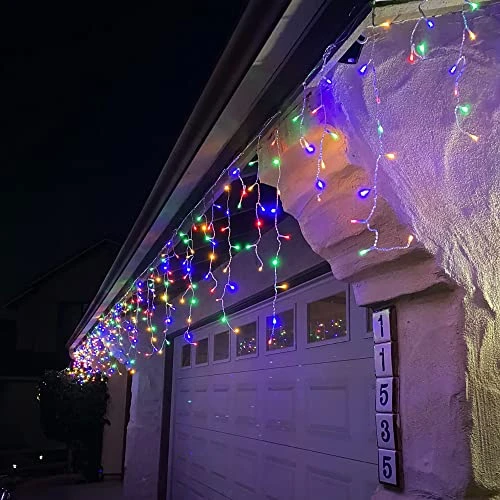 - Low Voltage & Waterproof: Both Christmas icicle lights and transformer are IP 44 waterproof. These outdoor icicle lights have a low output of 29V through a plug-in transformer, is very safety for use. Perfect for outdoor using can withstand rain and snow. It won’t over heat after long time using. Note: Prevent plugs from being submerged in water.