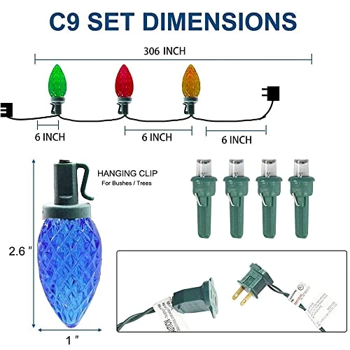- End to End Connectable: Each outdoor Christmas light designs with tail plug, can connect up to 30 sets of C9 string lights, (MAX 1500 LED) allow you to decorate your lighting area with the desired length.