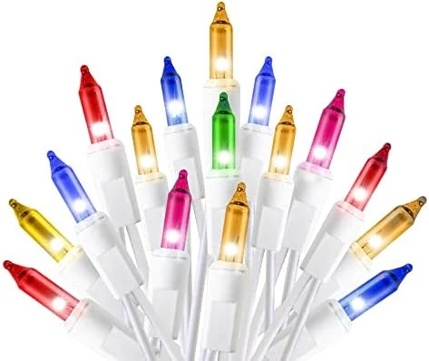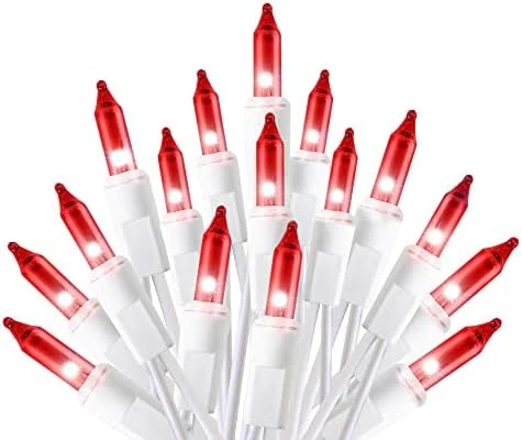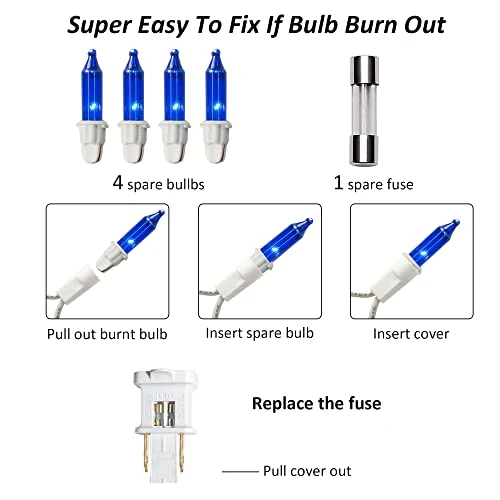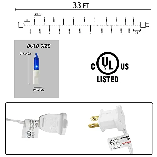 - Package include: 1 x 33 ft string light, 1 x spare fuse, 4 x extra incandescent light bulbs. Christmas mini clear string lighted length is 31 FT, leading wire is 2 ft, and the bulb spacing is 2.5 inch, 2.5V and 0.42W per bulbs. The pure white wire will hide on the snow as if there is only blue light, is suitalbe for outdoor use.