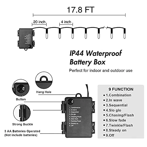 - 8 Modes: The lights with 8 different modes, combination, in wave, sequential, slo glo, chasing/flash, slow fade, twinkle / flash, steady on.