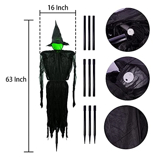 - Dimensions: The witch height is 63 inch when stand on the ground and the shoulder width is 16 inch. Seen from behind, standing like a real witch in your courtyard, bringing a strong Halloween holiday atmosphere
