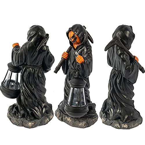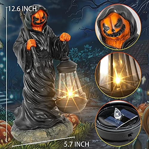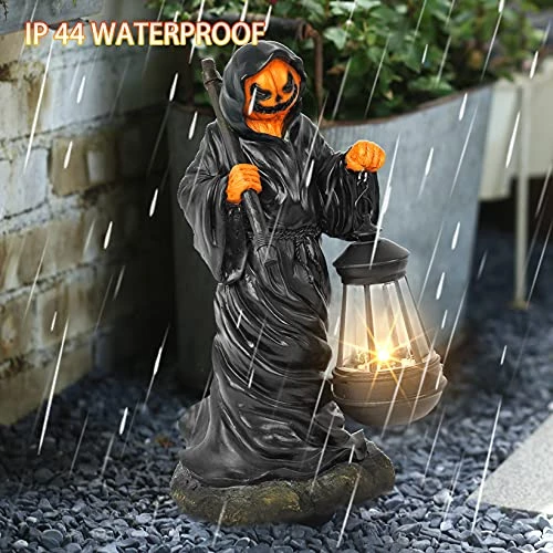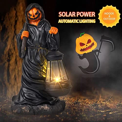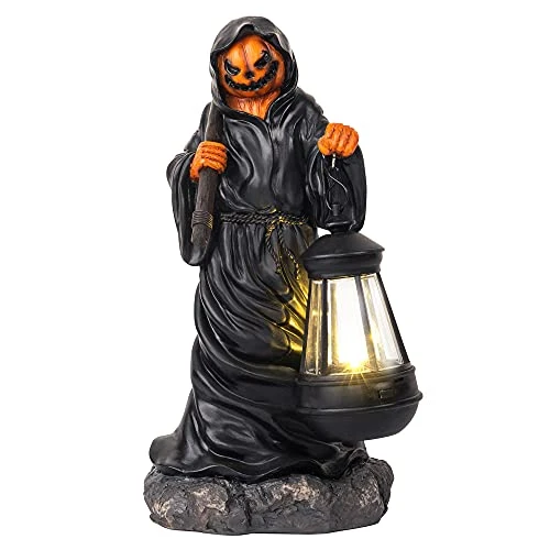 I have a tradition of buying one unique Halloween item per year. This guy won. He’s pretty solid and I haven’t had issues with the solar light but I will repaint him and put an LED tea light in the lantern instead. I like to customize and this is a good little art project.