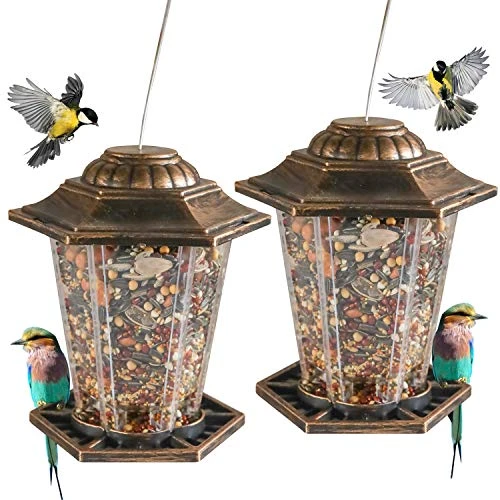 Cute to look at, birds perch with ease. I was hoping the tiny feeding area would keep off the blackbirds, but it didn’t.It wasn’t a promise with the product, but my wishfilled thinking.It is difficult the fill them without taking the feeder down. Mine are already zip tied up because of the squirrels, so I still prefer to lift the lids, tilt and fill, tighten cap. These feeders tilt and spill during filling from a hanging position.I was hoping they were a bit more sturdy as other feeders of the same type..They are pretty nice to look at. No ugly sticky labels. No swinging squirrels yet!Instead of investing additional money in sturdy feeding poles to set them on, I would probably prefer a different feeder. Our ground is frozen solid and hammering poles right now isn’t an option. also, I do not know if they sit level on a pole or no. In warmer weather I can try these on a garden pole and perhaps love the outcome. Until then, would I buy it again, no. If I do love them on a pole then I may still need to replace a couple garden poles, back to where to spend the money… If you don’t mind spillage and a bit of an added chore you’ll enjoy these. They are cute, but….