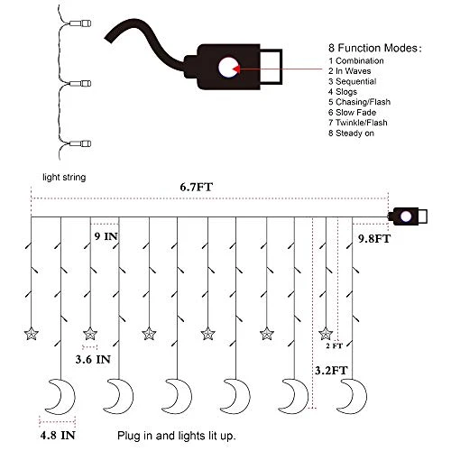 - ☪️8 FUNCTION MODES FOR YOU TO CHOOSE: Just press the button on the remote control to switch between 8 different modes. Meet the needs of different occasions. There are Combination, In Waves, Sequential, Slogs, Chasing/Flash, Slow Fade, Twinkle/Flash, Steady on. And you also can turn on/off the power with the romote control. Besides,the control can be automatically on and off every day, adjust the brightness.